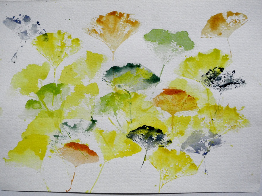 水彩授業で押し花(?)風に拾った葉っぱでプリントしました。